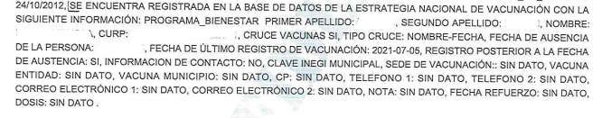“Se obtuvo que la persona desaparecida de nombre Ivette Melissa, primer apellido Flores, segundo apellido Román, CURP sin dato, edad 19 años, sexo mujer, fecha de nacimiento sin dato, entidad de nacimiento sin dato, lugar de nacimiento sin dato, nacionalidad mexicana […]. Se encuentra registrada en la base de datos de la estrategia nacional de vacunación con la siguiente información […] fecha del último registro de vacunación 2021-07-05, sin información de contacto, sin dato de vacuna, ni sede de vacunación”, se lee en el documento.