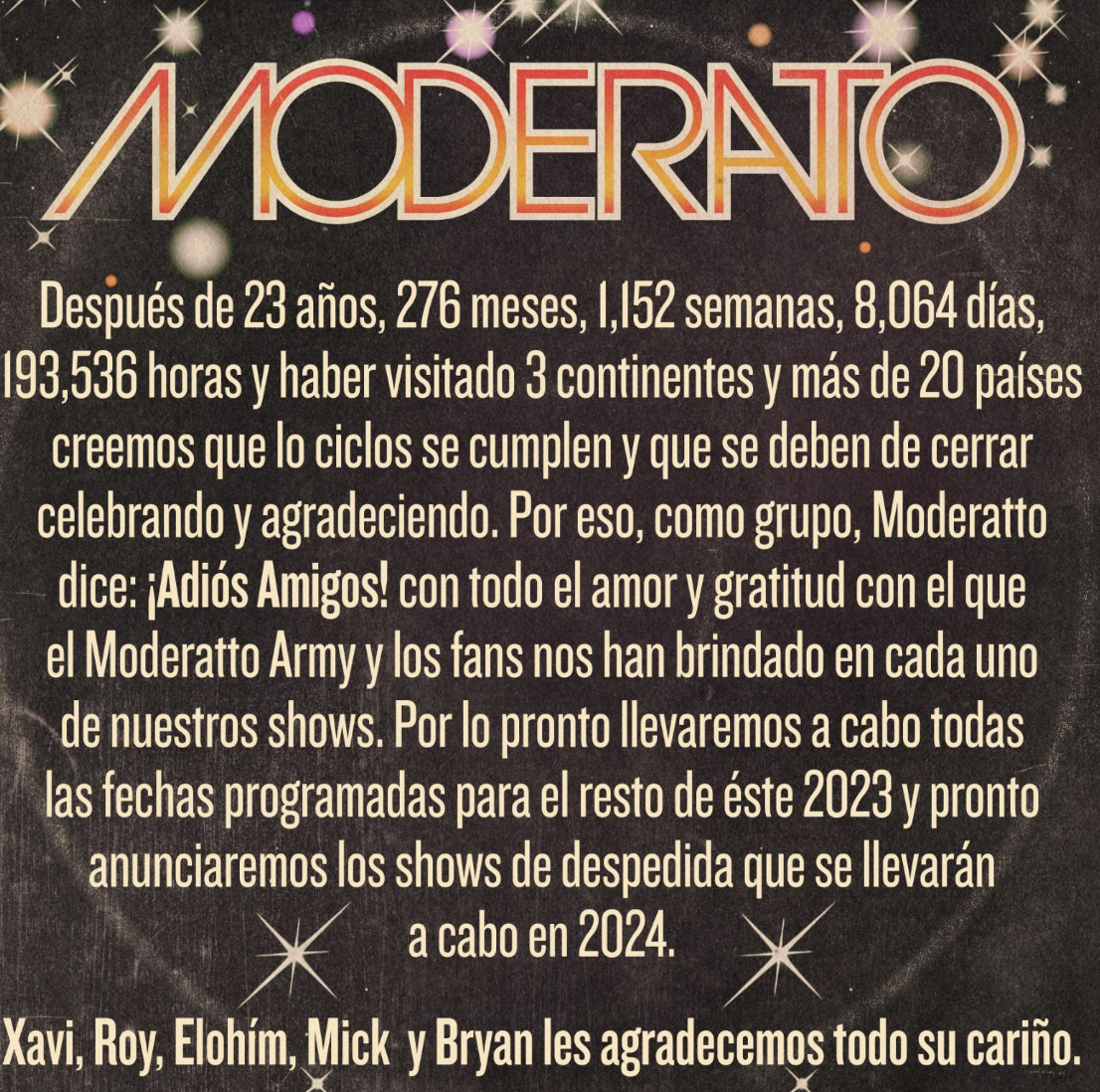 “Después de 23 años, 276 meses, mil 152 semanas, 8 mil 064 días, 193 mil 536 horas y haber visitado 3 continentes y más de 20 países, creemos que lo ciclos se cumplen y que se deben de cerrar celebrando y agradeciendo. Por eso, como grupo, Moderatto dice: ¡Adiós Amigos!”.