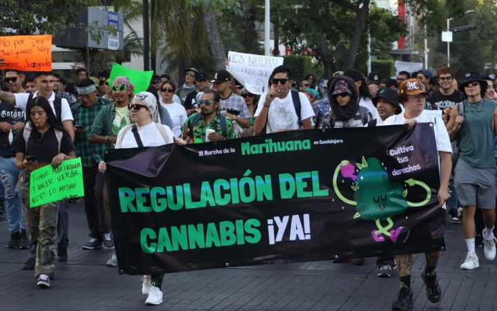 En la manifestación de Guadalajara, los activistas demandaron que se legisle la cannabis “con apego a las necesidades de quienes consumen, cultivan, proveen medicinalmente y que se respete el derecho humano a la libre asociación y organización con otras personas vinculadas con el cannabis.