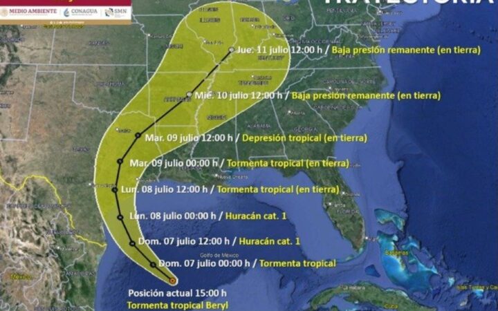 “La tormenta tropical Beryl se desplaza sobre el centro del Golfo de México hacia el noroeste. El extremo del cono de incertidumbre se localiza sobre el sur de Texas“, indicó el SMN en un comunicado.