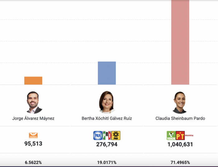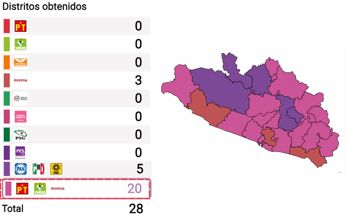 Finalmente, en la elección presidencial, el pueblo de Guerrero, en su conjunto, votó en 71.4% a favor de la continuidad del proyecto obradorista, mientras que a la oposición encabezada por Gálvez obtuvo un 19% de las preferencias electorales, ganando la coalición oficialista por más de 700,000 votos.