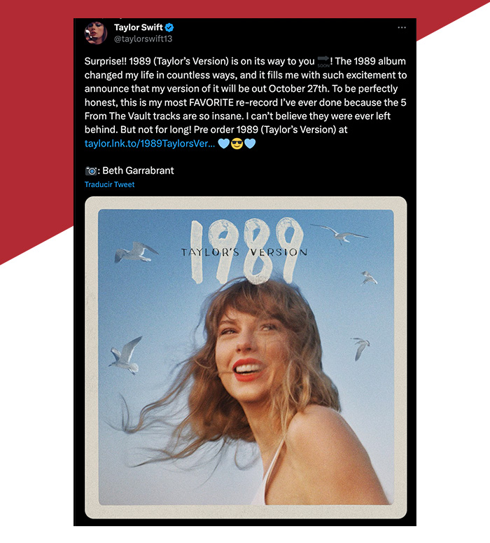 La noche del 9 de agosto, en su último show de Te Eras Tour en Los Ángeles, California, la cantante anunció el relanzamiento de su álbum ‘1989’ ante más de 100 mil personas.