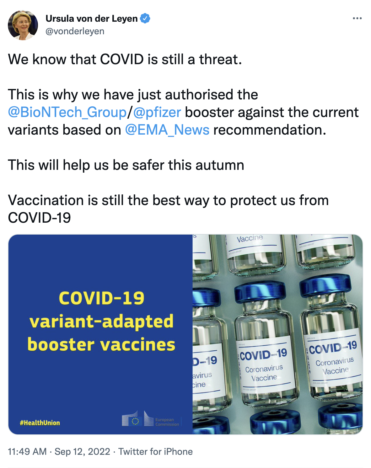 La presidenta de dicha Comisión Europea, Ursula von der Leyen, en un mensaje publicado en Twitter, garantizó que “esto nos ayudará a estar más seguros este otoño. La vacunación sigue siendo la mejor manera de protegernos de la COVID-19”.