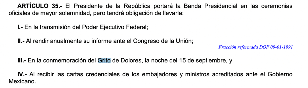En ninguno de los tres casos existe una ley o reglamento que obligue al Presidente de la República y titular del Poder Ejecutivo Federal a invitar a los representantes de los otros dos poderes a la ceremonia cívica del Grito de Independencia que tendrá lugar este 15 de septiembre o a encabezar el Desfile Militar del sábado 16 de septiembre para celebrar el inicio de la Independencia de México.