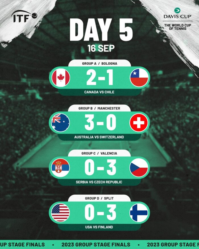 La Fase Final de la Copa Davis añadió tres nuevos países clasificados este sábado con Australia, Canadá y Finlandia abriéndose paso en sus grupos para unirse a Serbia, Países Bajos y República Checa, con dos billetes en juego para este domingo.