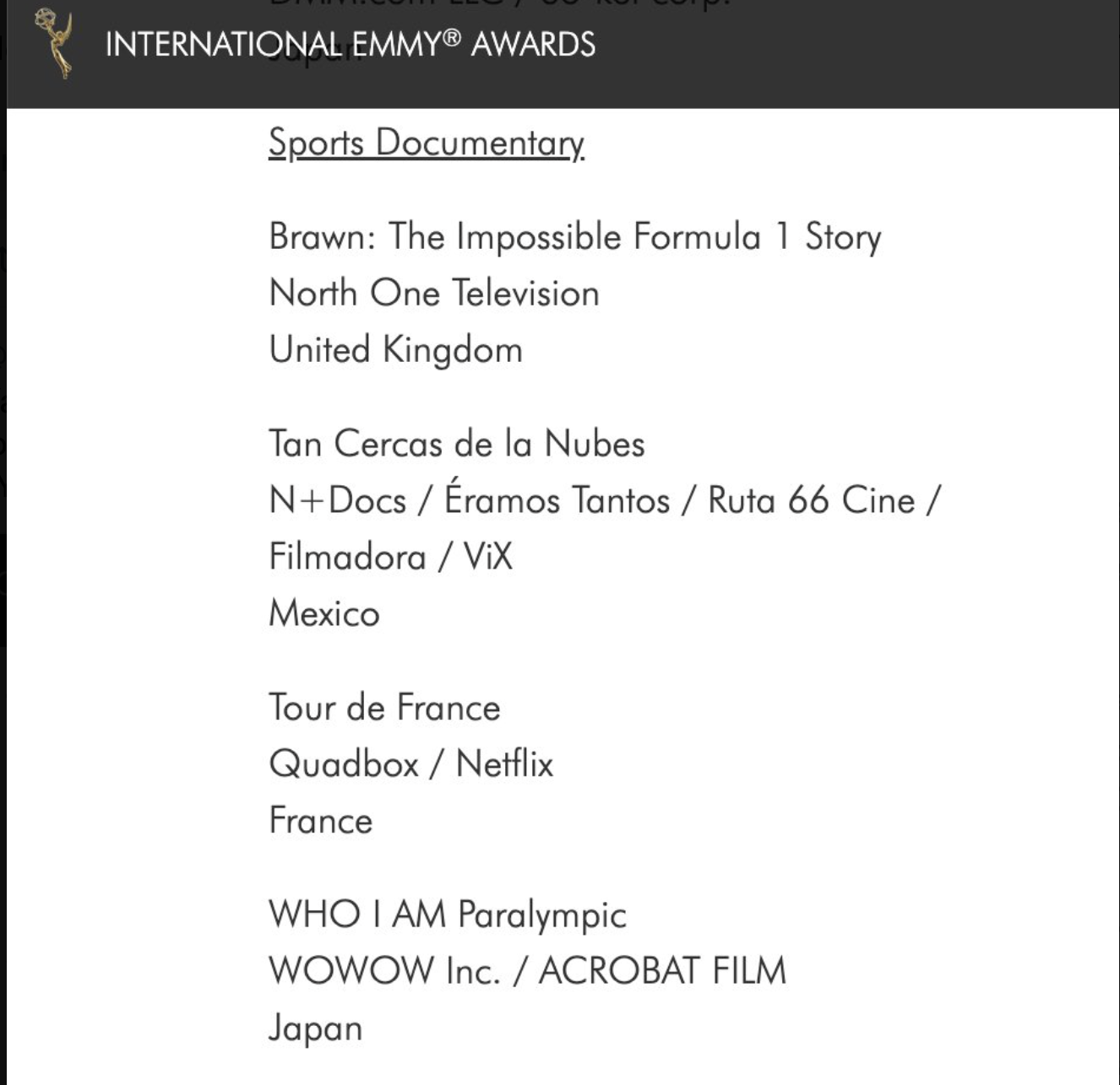 “Tuvimos la fortuna de ser nominados en la categoría de mejor documental deportivo dentro de la entrega de los Emmys Internacionales 2024, ceremonia en la cual se premia a lo mejor de los contenidos que van para la televisión, hoy en día para la plataforma, a lo largo y ancho del mundo”, explicó Cañibe.