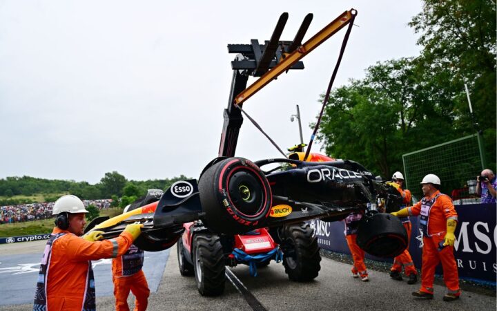 El mexicano Sergio ‘Checo’ Pérez, de Red Bull Racing, se estrelló contra el muro en la curva ocho del circuito de Hungaroring en la clasificación del Gran Premio de Hungría y provocó una bandera roja en la primera ronda (Q1) a falta de 6 minutos y 45 segundos para el final.