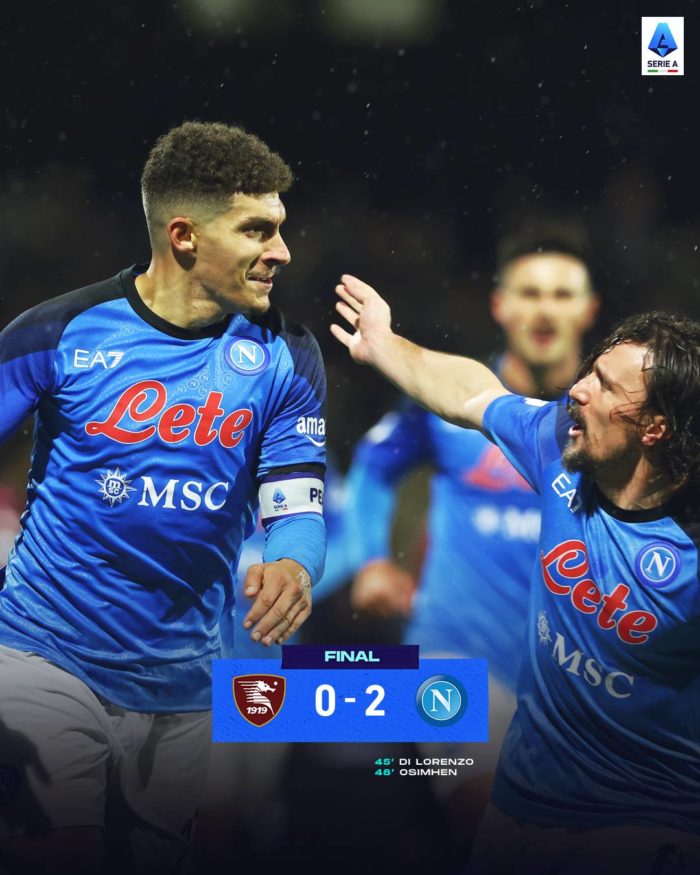 Napoli, líder de la Serie A, venció 0-2 al Salernitana este sábado y debido a la sanción de quince puntos impuesta a la Juventus, su principal rival, se coloca a doce puntos del segundo lugar, AC Milan, que todavía tiene que disputar su partido de esta jornada.