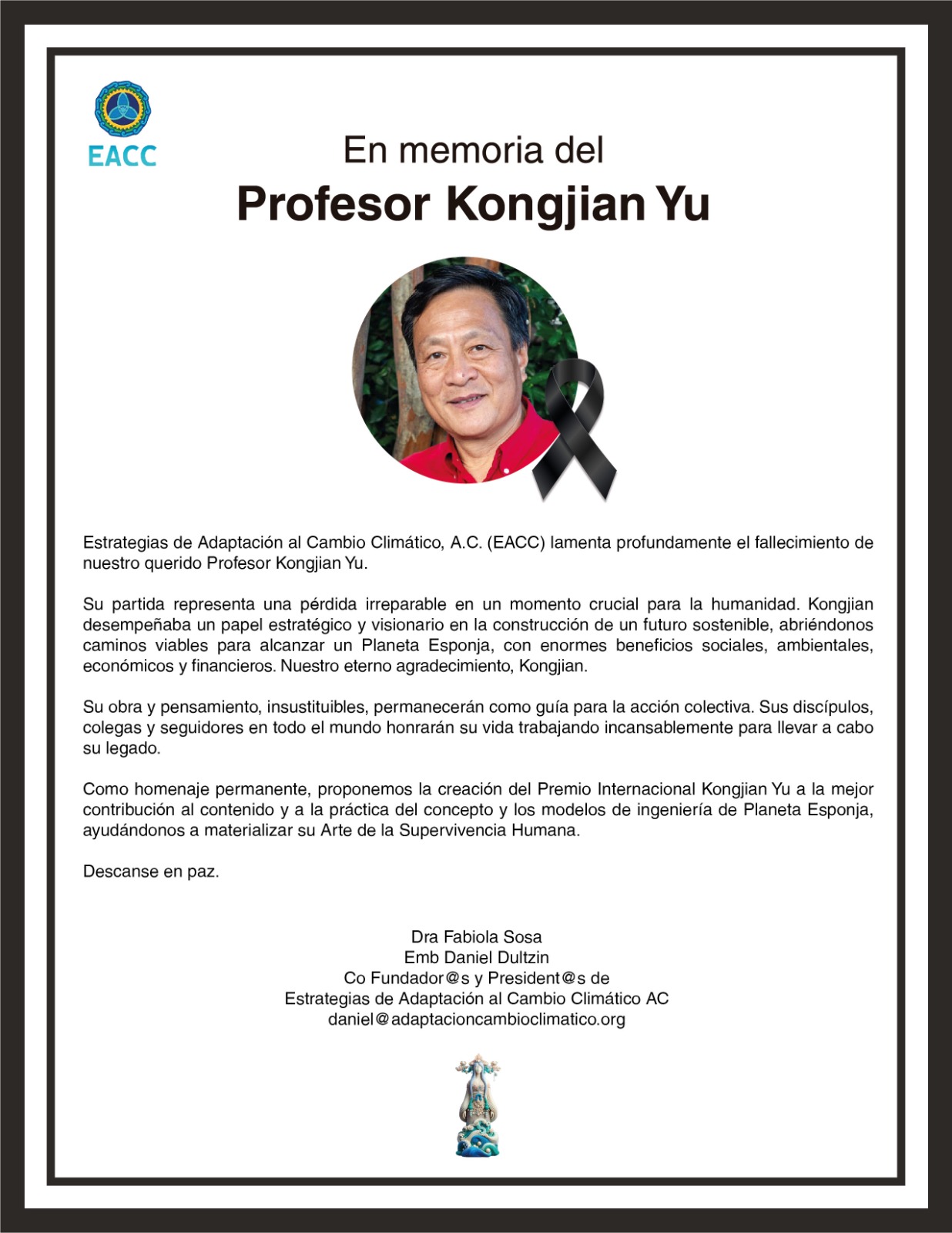 Para mantener vivo su legado, la organización propuso crear el “Premio Internacional Kongjian Yu”, destinado a reconocer las mejores contribuciones al desarrollo y aplicación del concepto “Planeta Esponja”. Según señalaron, “nos corresponde ahora honrar su legado trabajando incansablemente por llevar a buen puerto su propuesta”.
